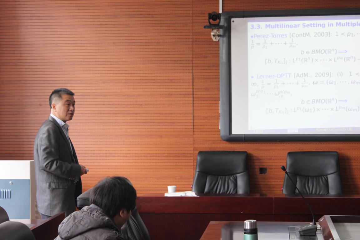 报告中, 伍火熊教授介绍了一些自己最近的工作,包括:BMO和CMO空间的刻画,奇异积分和分数次积分的加权有界性和紧性的刻画等。