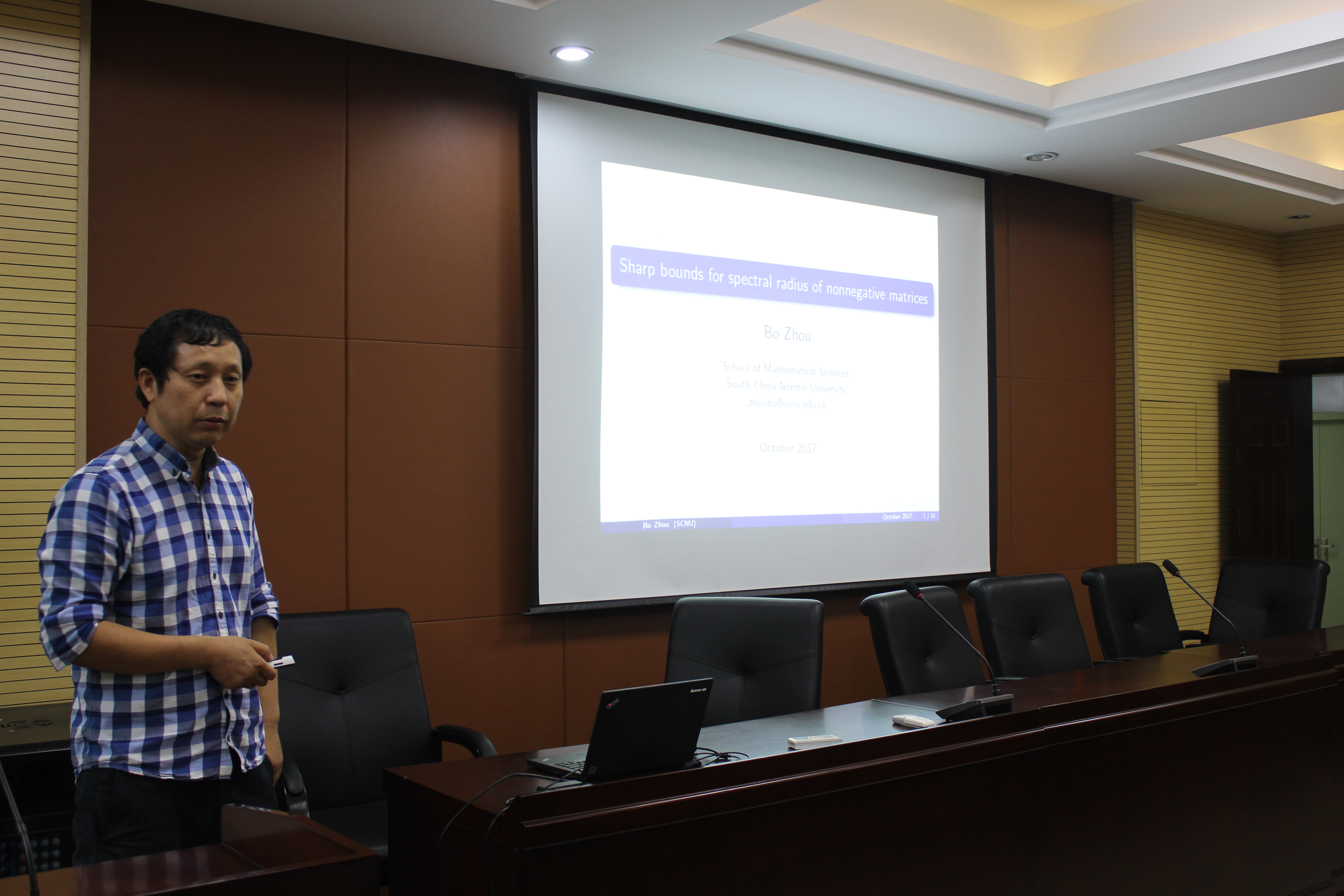 报告中周波教授介绍了非负矩阵的谱半径的上下界问题,利用行矩阵元求和方法去探讨矩阵特征,并对自己的研究成果做了详细阐述;郭曙光教授介绍了一些特定的图以及其上的拉普拉斯最小特征值问题,同时介绍了在代数图论和组合数论等方面的最新研究成果;李书超教授介绍了图论的相关研究,定义一个连通图G,探讨了超图上随机问题,给出了最新的研究成果。报告结束后,三位教授与在场师生做了进一步的学术交流。