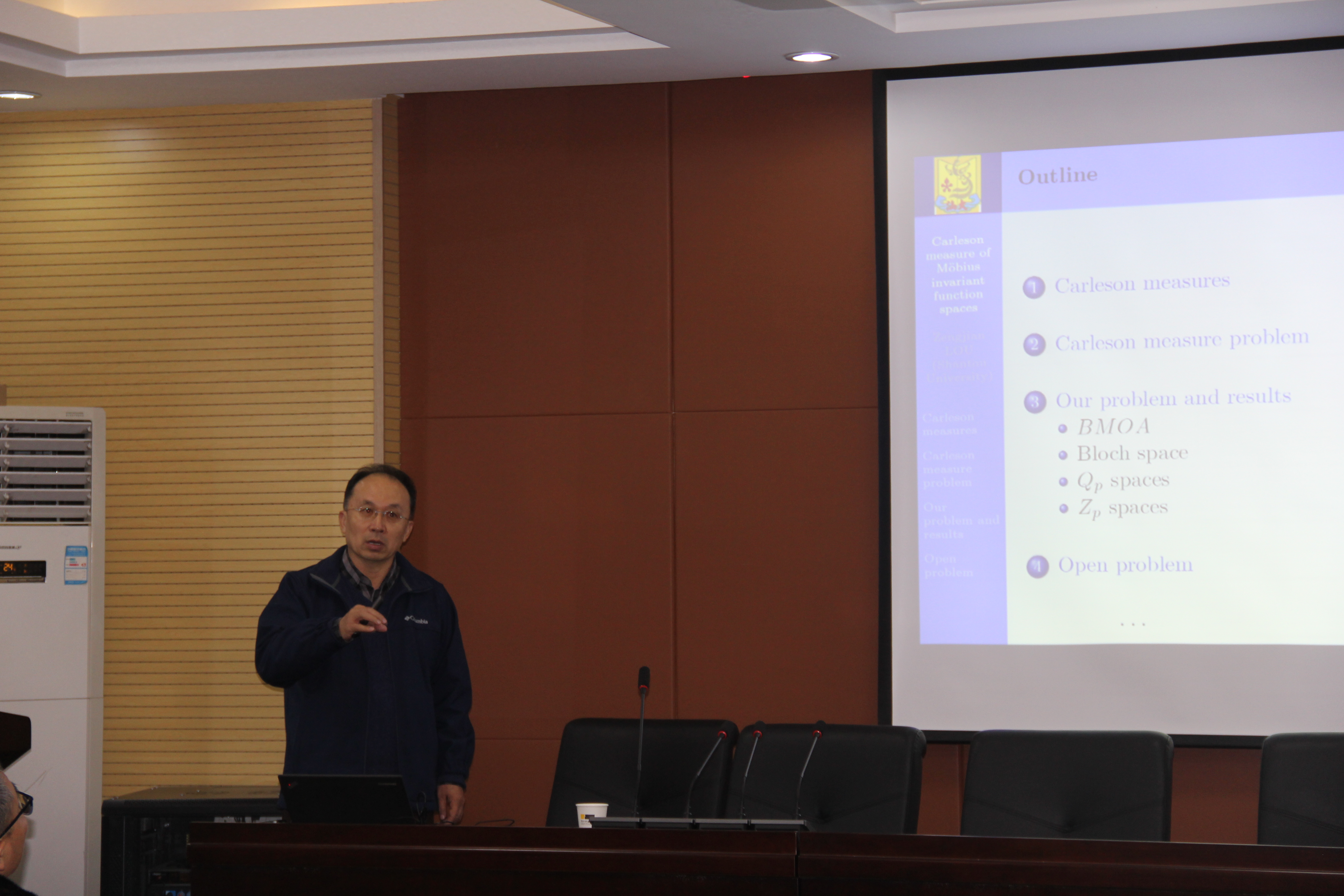 娄增建教授是国内复函数分析领域的专家,主要从事调和分析、复分析方面的研究工作,本次讲座中他介绍了自己近期的研究成果,提出对于一个单位圆上Bore测度μ,当且仅当μ是一个Carleson测度的时候我们会找到一个适度的空间X(μ),并存在一个从Mobius空间到 X(μ)的映射;然后分享了复分析中Hardy, Bergman,Bloch, BMOA等解析函数空间及其上的算子问题。