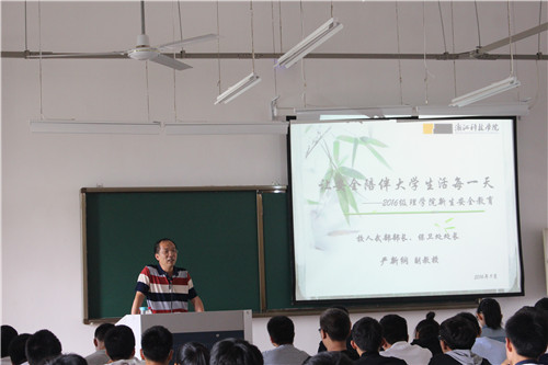 在安吉校区B-415教室为本院学生开展安全知识专题讲座,本次学院特邀校人武部部长、保卫处处长严新纲副教授,就政治安全、心理安全、卫生安全、交通安全这四大模块对学生展开了多方面的教育,保卫处张淑老师、安吉校区辅导员贾晓龙老师和全体2016级新生聆听了本次讲座。