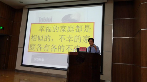 报告以列夫托尔斯泰的名句“幸福的家庭都是相似的,不幸的家庭各有各的不幸”开篇,曲安京对“幸福的家庭”、“不幸的家庭”的组成元素进行分析,引入许多电影和文学作品为例,帮助学生更好地理解“鸽笼原理与模式”。他又借用“均值和方差”概念,告诉学生,人生的价值,体现在方差的大小。我们在拉升均值的同时,鼓励方差的增大,这样才有创新、个性、多样性;与之相反,社会的稳定,体现在方差的控制,拉升均值的同时,要缩小方差的数值。