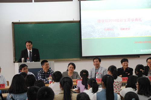 会上,陶祥兴发表了热情洋溢的致辞,他首先向跨入大学的147位新生表示热烈祝贺,并代表学院全体教职工欢迎新生加入理学大家庭。他从多角度阐释了大学与中学的区别,希望新生们尽快适应大学生活,通过四年的学习,努力把自己锻炼成为“厚基础、强应用、国际化”的有用之才。苗红亚也在会上发言,她认为进入大学,不仅仅是学知识,更是学做人。她希望新生们要明确学习目标,学会自我管理,学会自主学习,努力做到校党委提出的“七个一”。 两位系主任、老生代表、新生代表也在会上分别发言。