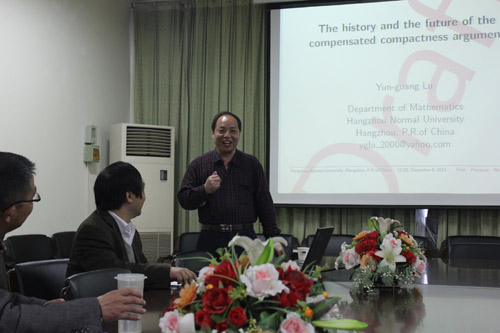 数学家陆云光教授为哥伦比亚国家科学院院士,曾主持中科院百人计划项目,浙江省特聘专家。近年来,陆教授一直活跃在双曲守恒方程(组)这一研究领域。本次报告中,陆教授介绍了补偿紧致理论在双曲守恒定律中的相关应用以及将来新的应用,并与大家分享了他本人在此领域的一些重要研究成果。报告结束后,与会教师纷纷与陆教授就报告中相关细节进行了热烈的讨论,陆教授一一作了详细的解释。