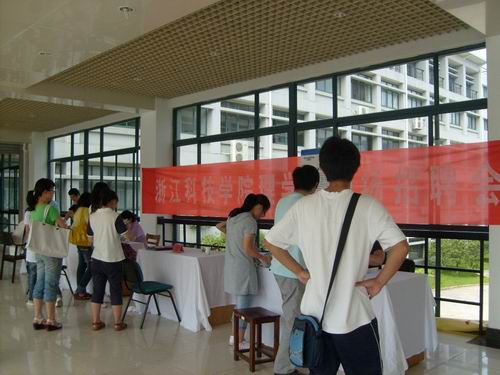 于6月12日下午2:00举行了2008届毕业生专场招聘会,中国安防技术有限公司,杭州奥威计算机技术开发有限公司,杭州雷鸟计算机软件有限公司,浙江浙农爱普贸易有限公司四家单位参加了本次招聘会。